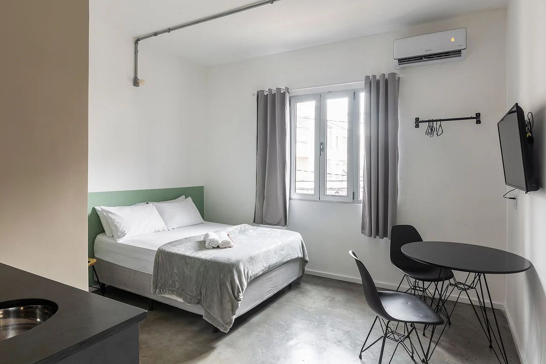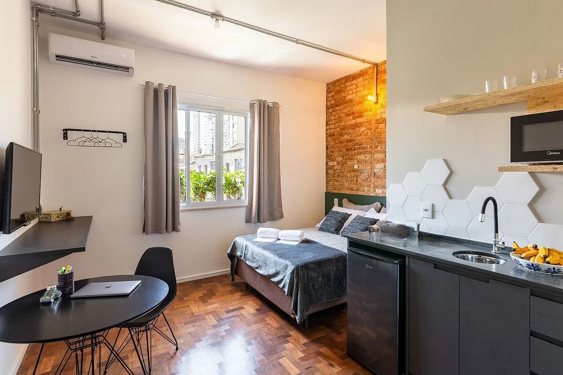 Nosso apartamento vem equipado com ar-condicionado, micro-ondas, frigobar, conexão com wifi. Roupas de cama e toalha de banho também incluída na reserva. Ideal para homeoffice.